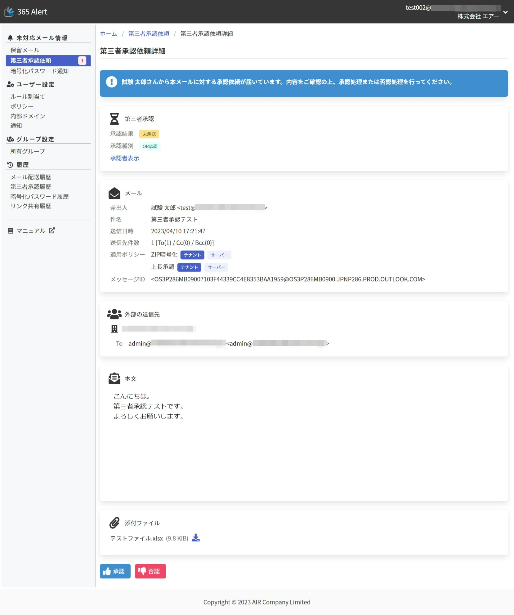 受信した通知の[管理ポータルを表示]ボタン または[詳細確認]ボタンをクリックすると、管理ポータルの以下の第三者承認依頼詳細画面が表示されます。