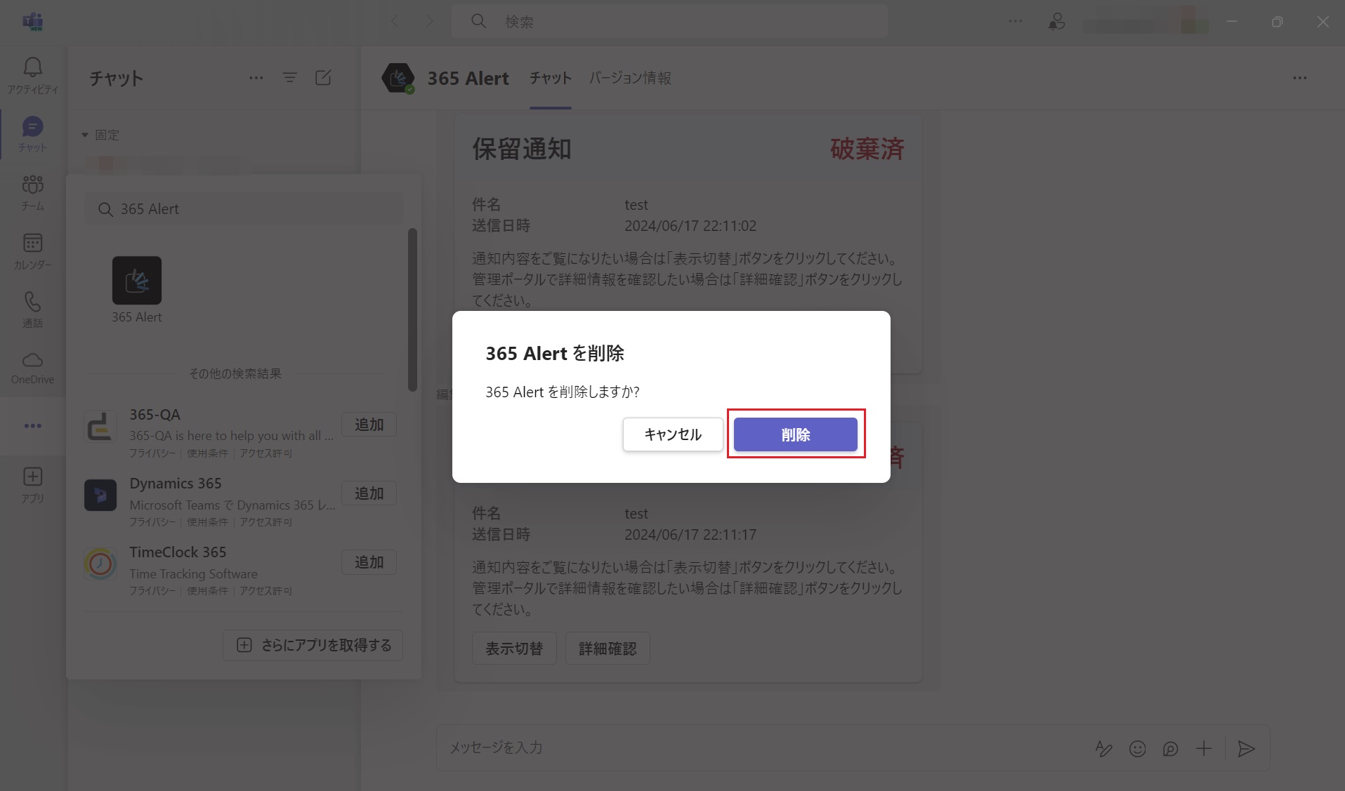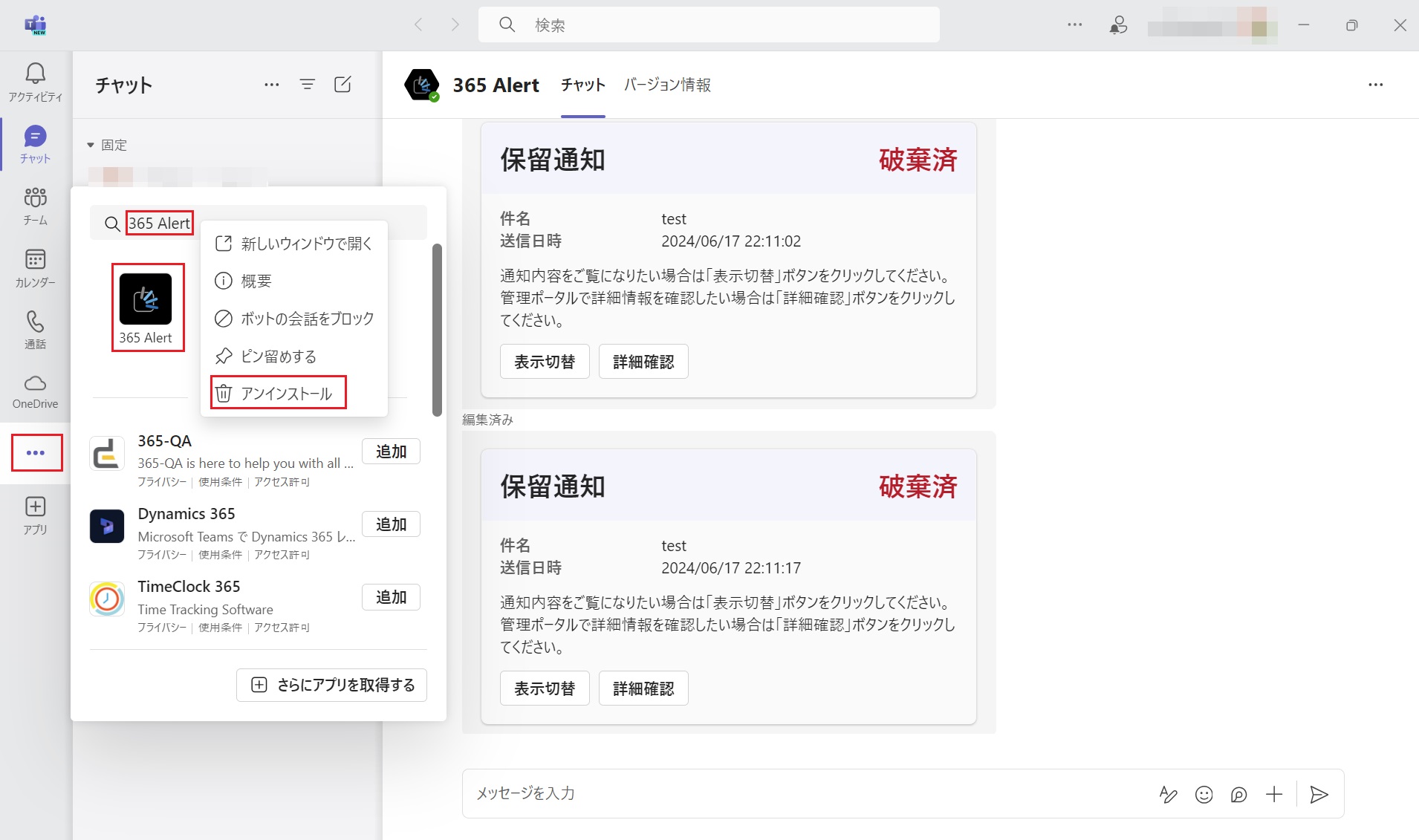 以下ではMicrosoft Teamsから365 Alertアプリをアンインストールする手順を記載します。