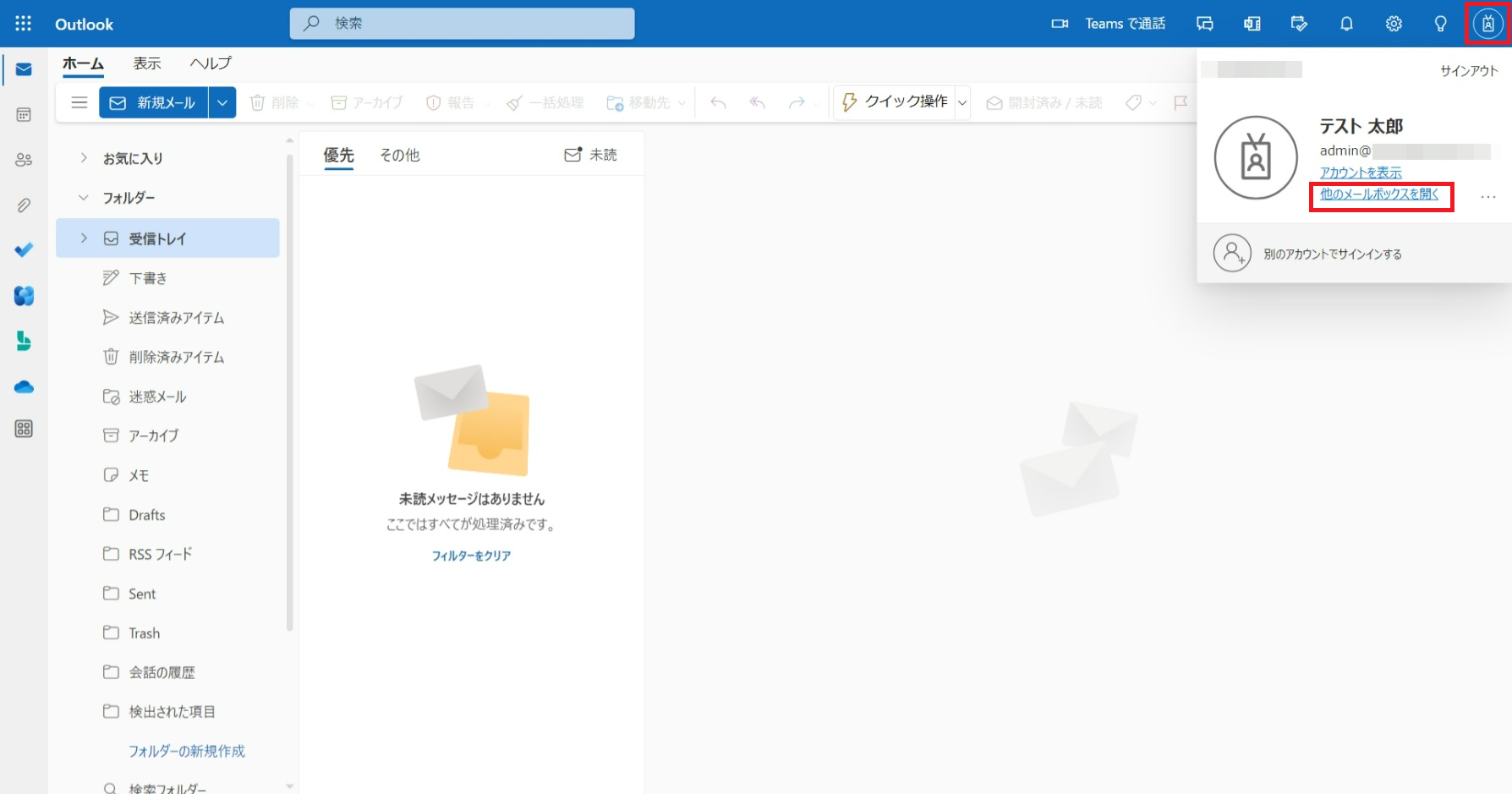 Microsoft側の制限により、Outlook on the webで「他のメールボックスを開く」から共有メールボックスを開いてメールを送信する場合は、Outlook Add-inが正しく動作しない可能性があります。「他のメールボックスを開く」以外の送信方法をご利用ください。