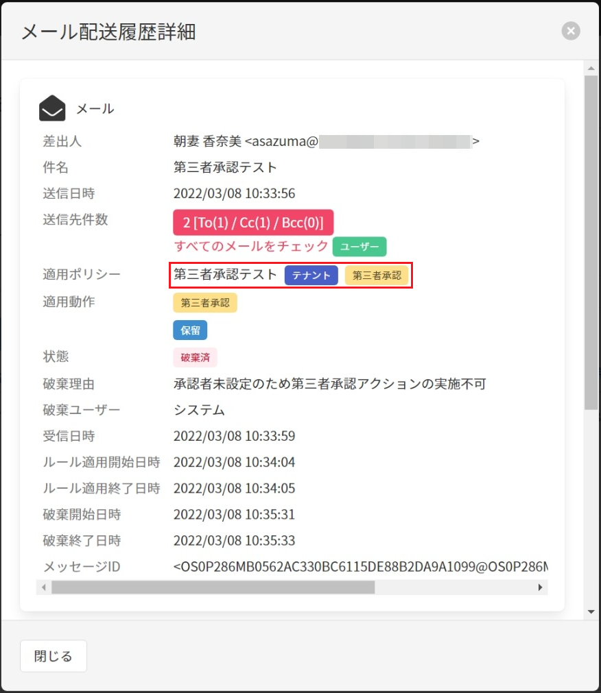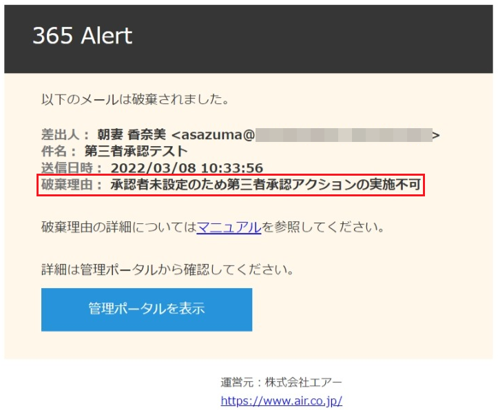 第三者承認ポリシーアクションで承認されなかった場合には、以下の内容の破棄通知メールが届きます。