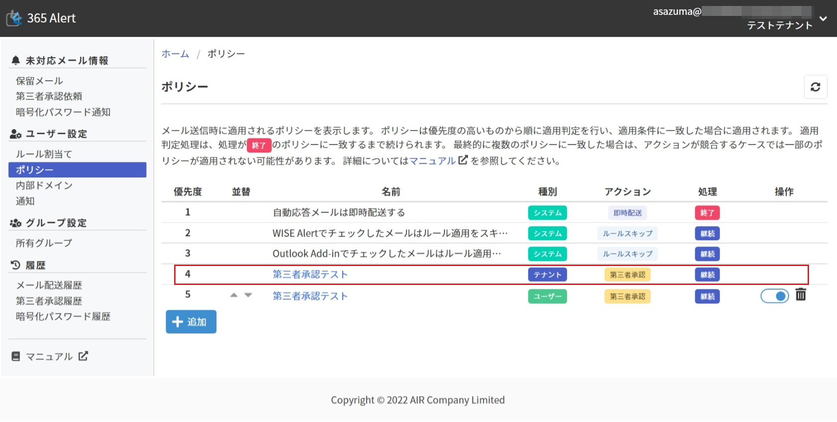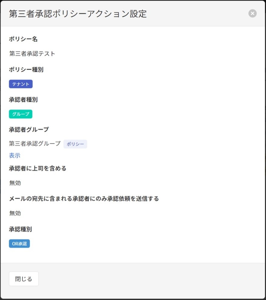 以下の画面では、名前が「第三者承認テスト」、種別が「テナント」です。