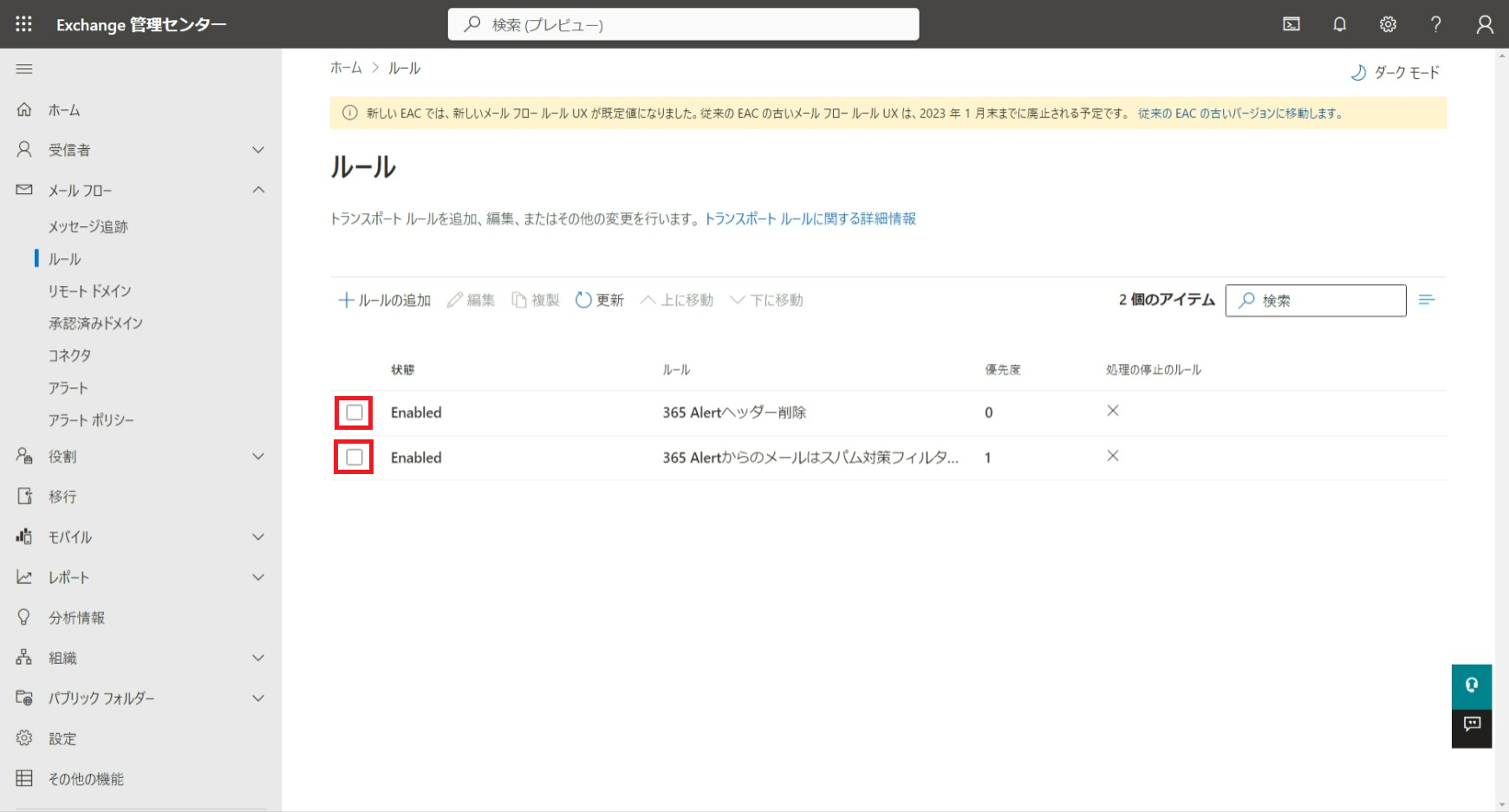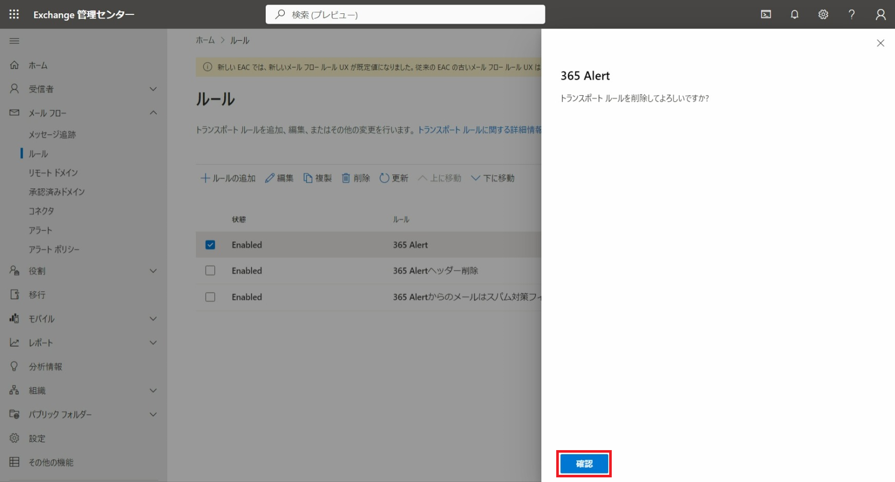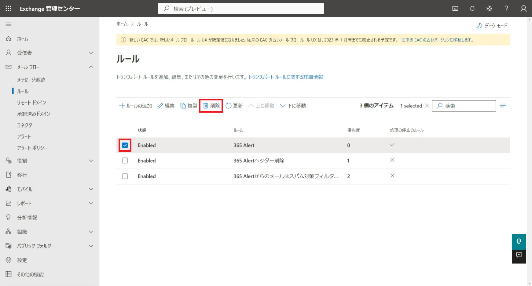 365 Alertヘッダー削除ルールと365 Alertからのメールはスパム対策フィルターをバイパスするルールを削除します。