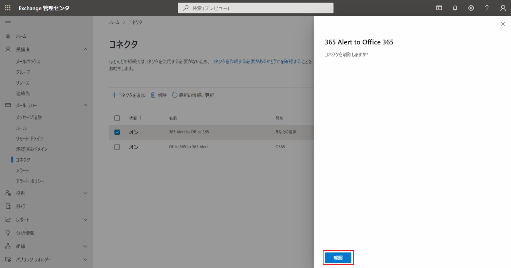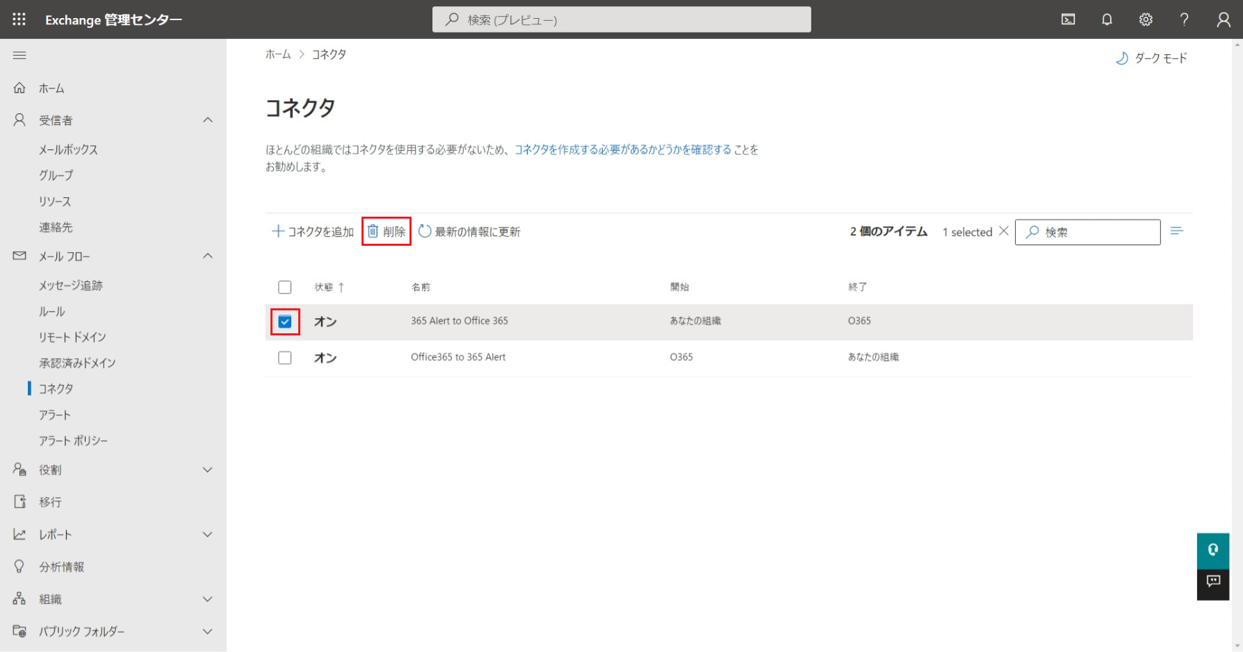 365 Alert to Office 365コネクタのチェックボックスをチェックして、[削除]ボタンをクリックします。