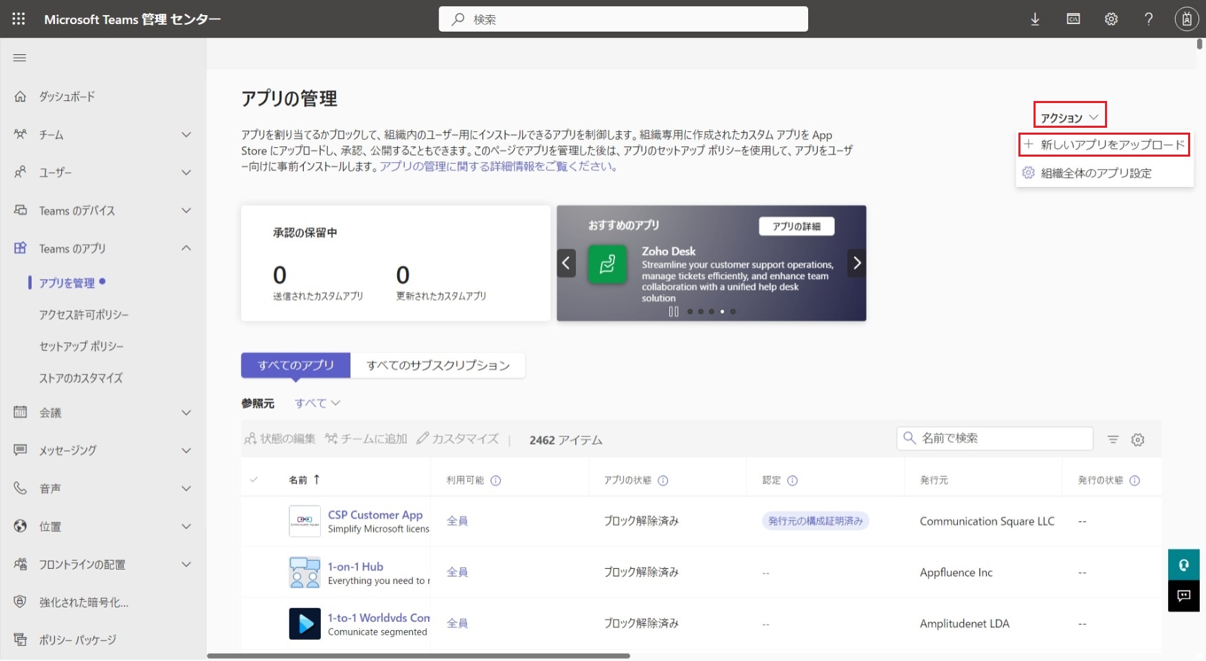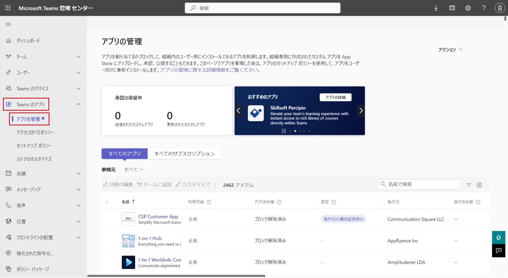 画面左のメニューから[Teamsのアプリ]>[アプリを管理]をクリックします。