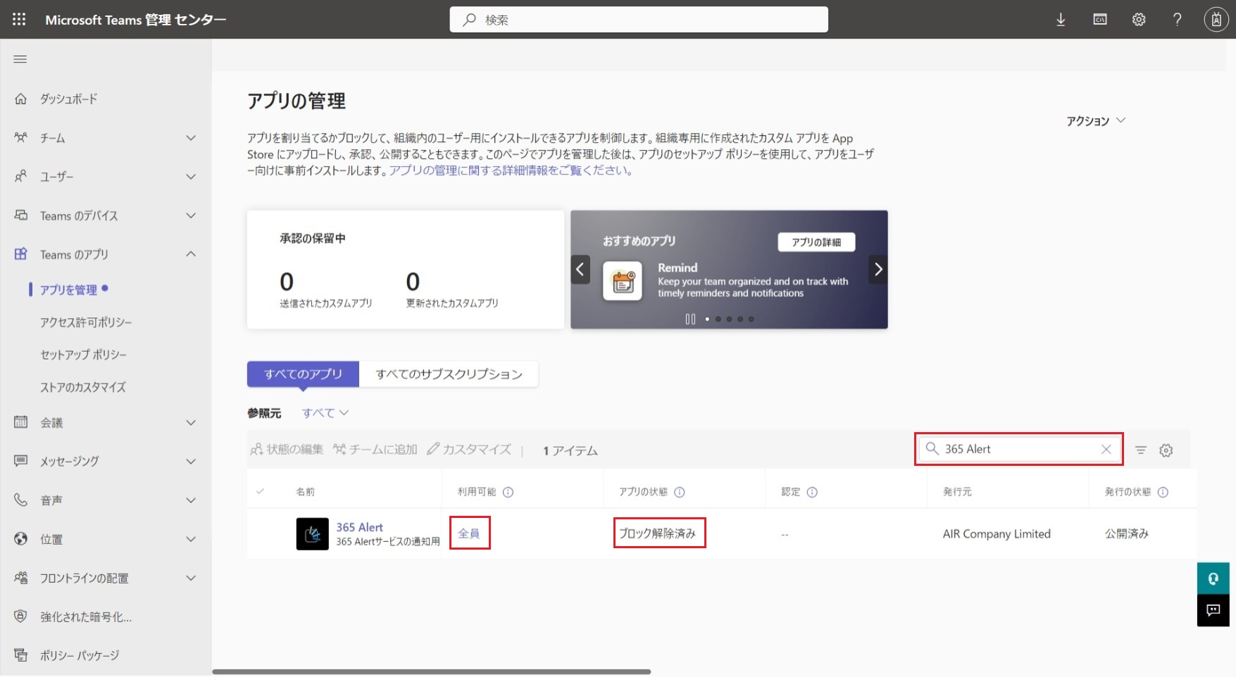 365 Alertと入力して、[365 Alert]が表示されることを確認します。また、利用可能が全員、アプリの状態がブロック解除済みと表示されていることを確認します。