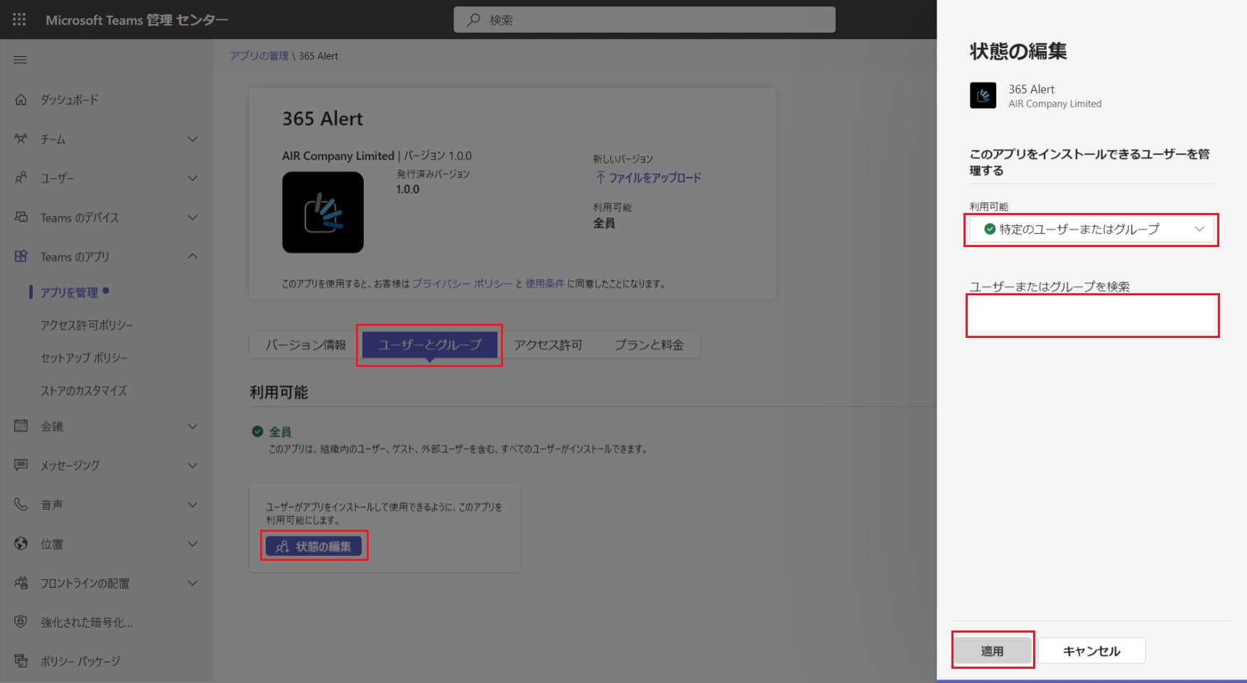 365 Alertをクリックして表示された以下の画面で、[ユーザーとグループ]タブを選択し、[状態の編集]をクリック後表示された[状態の編集]画面で、[利用可能]に特定のユーザーまたはグループ、[ユーザーまたはグループを検索]で利用を許可したいユーザーまたはグループを選択します。[適用]をクリックして設定を保存します。