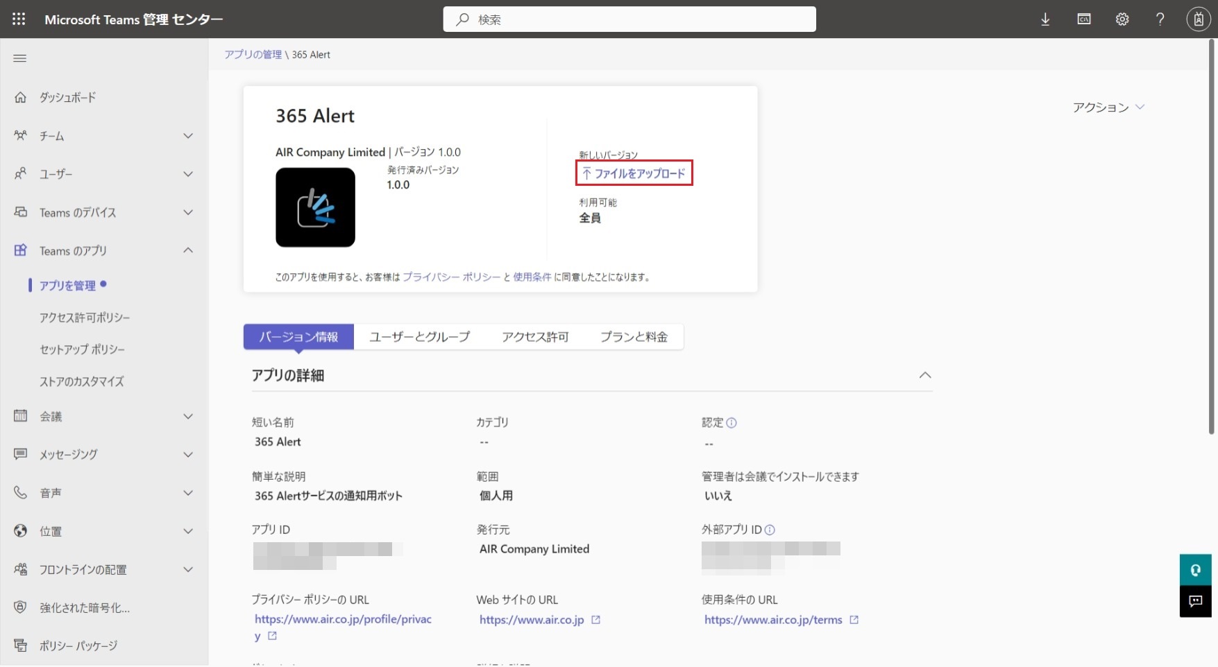 ユーザーがTeams通知を受け取るためのアプリをインストール出来るように、Teamsに365 Alertアプリのアップロードを行います。